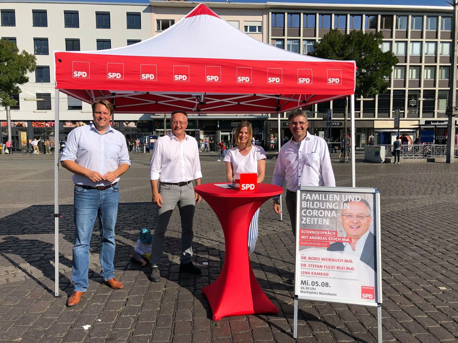 Wir haben erneut auf dem Mannheimer Marktplatz diskutiert. Diesmal hatten wir Andreas Stoch, den ehemaligen Kultusminister und Fraktionsvorsitzenden der SPD im Landtag zu Gast. Es ging vorrangig über die Familien- und Bildungspolitik in Corona-Zeiten.
