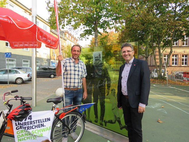 An einem schönen Herbsttag machte der Landtagsabgeordnete Stefan Fulst-Blei mit seinem mobilen Fahrrad-Infostand Halt am Seppl-Herberger-Platz auf dem Waldhof. Den ersten Kontakt an diesem Ort hatte er zu einigen Schuljungs, die den Platz zum Kicken nutzten. Das fand er natürlich als Waldhof-Fan gut, dass an diesem Ort der Erinnerung an die Mannheimer Fußball-Legende der Nachwuchs übte. Dafür schob er sein Fahrrad gerne ein paar Meter zur Seite.