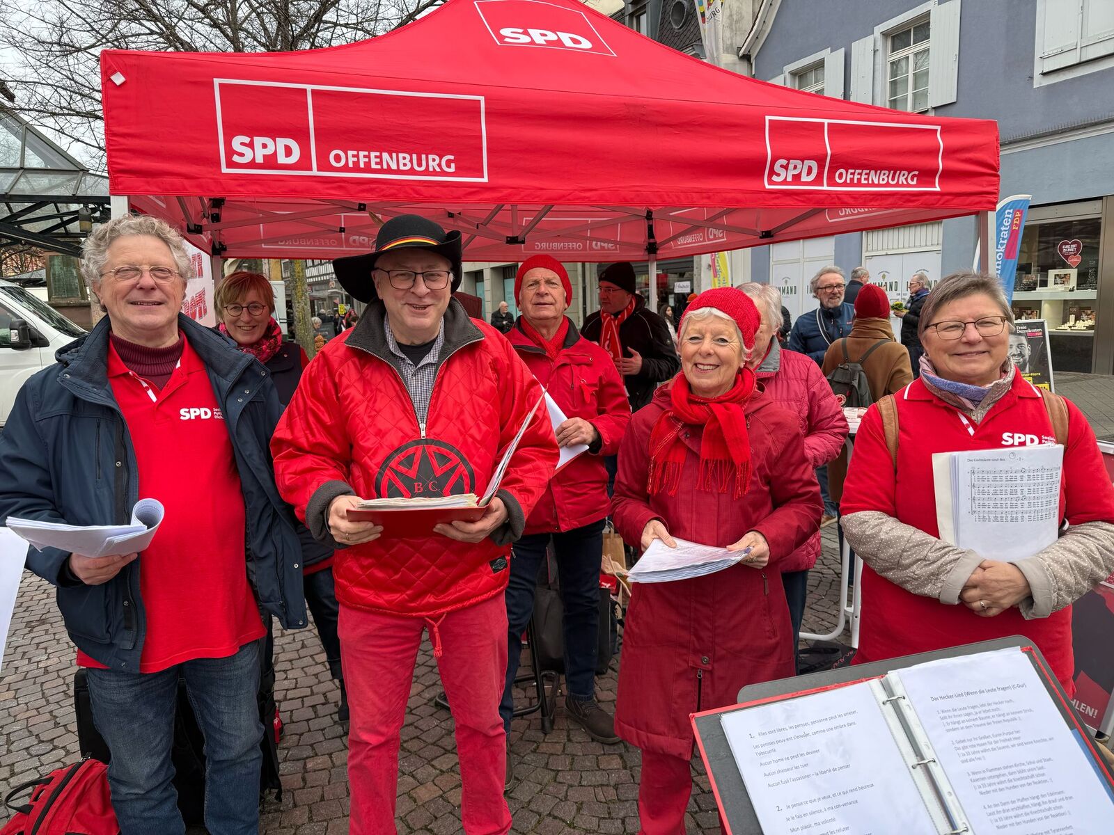 Beim Wahlkampf-Endspurt am Infostand der SPD in Offenburg wurden die Roten Socken von Andras Hecker tat-und stimmkräftig unterstützt.