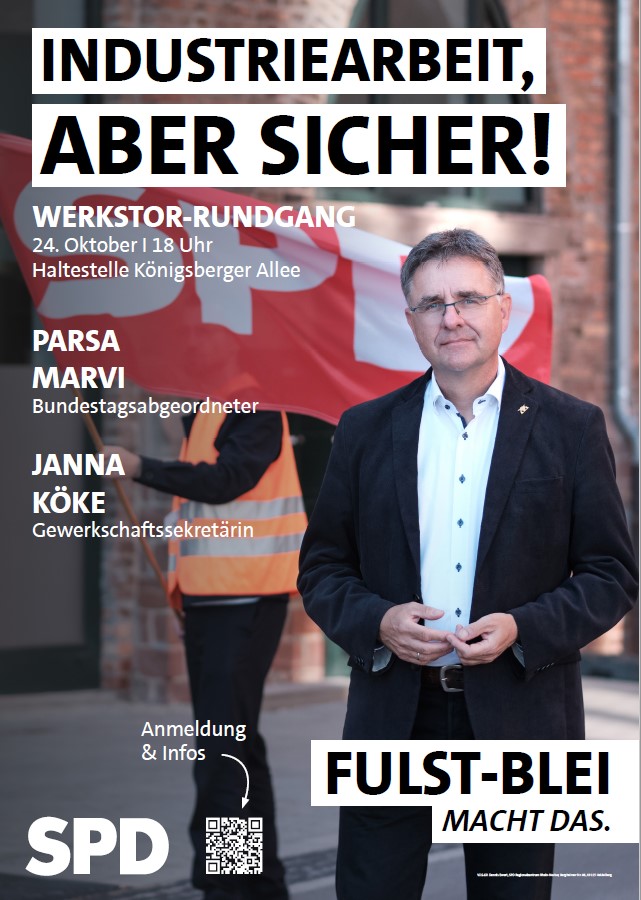 Mit Parsa Marvi (MdB, Finanzpolitik) und Dr. Stefan Fulst-Blei (MdL, Mannheim-Nord) werden wir an den Werkstoren gemeinsam mit Vertreterinnen und Vertretern der Betriebsräte und der Gewerkschaften einen Blick in unsere Industriebetriebe werfen. Was passiert am Standort? Vor welchen Herausforderungen stehen die Unternehmen? Wie können wir mehr Menschen in gute Arbeit bringen?