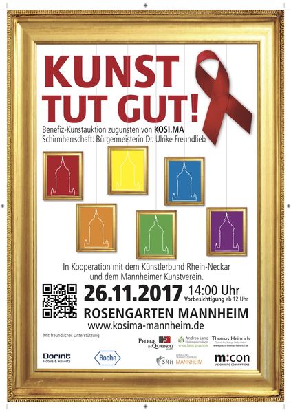 Am 26.11.2017 (dem Sonntag vor dem Welt-AIDS-Tag) lädt KOSI.MA in Kooperation mit dem Künstlerbund Rhein-Neckar, dem Mannheimer Kunstverein und der m:con – mannheim:congress GmbH zum 4. Mal zur Benefiz-Kunstauktion „Kunst tut gut!“ zu Gunsten von KOSI.MA ein. Schirmherrin ist Bürgermeisterin Dr. Ulrike Freundlieb.