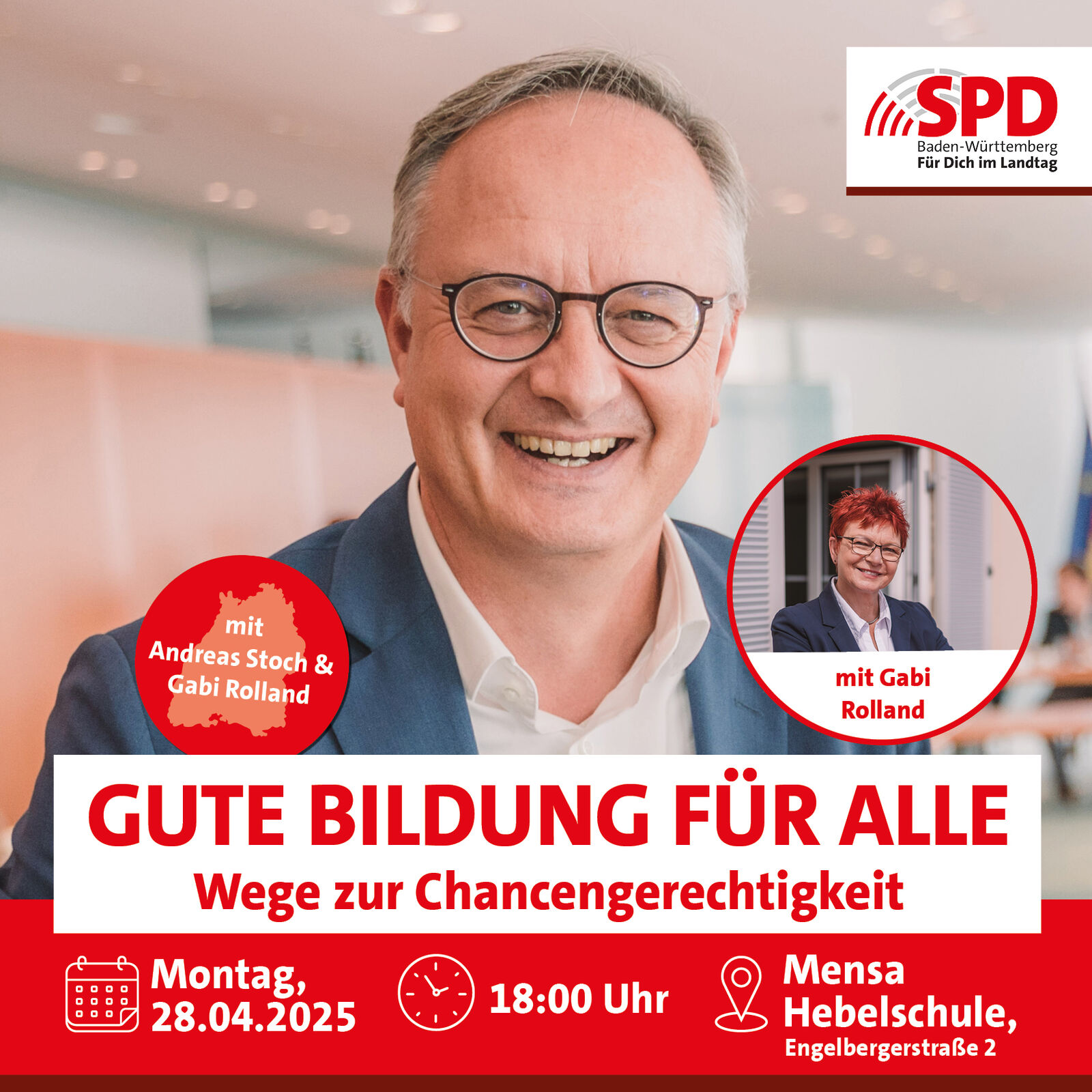 Gemeinsam mit Andreas Stoch, SPD-Landes- und Fraktionsvorsitzender, wollen wir diskutieren, wie eine moderne Bildungspolitik aussehen kann, die kein Kind zurücklässt, und welche konkreten Maßnahmen dafür in Baden-Württemberg erforderlich sind.
