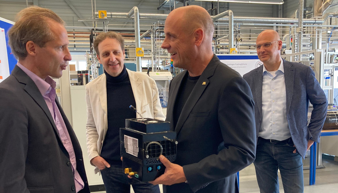 Ein zentrales Thema des Besuchs war die Transferforschung im Bereich der Wasserstofftechnologie. Prof. Dr. Schmitz, Studiengangsleiter für Mechatronik, präsentierte die aktuellen Forschungsarbeiten zur Wasserstofferzeugung und Brennstoffzellentechnologie. Die Bedeutung der Wasserstofftechnologie für eine nachhaltige Mobilität illustrierte er anhand des Projektes „Hydrogen Fueling@Home“. Ziel ist es dabei, Wasserstoff vor Ort aus erneuerbaren Energien zu erzeugen und Brennstoffzellenfahrzeuge effizient damit zu betanken. Bei der in Sinsheim ansässigen B&S Service GmbH – einem Projektpartner der DHBW Mannheim – ist die wasserstoffbetriebene Firmenflotte keine Utopie mehr: Im Rahmen des wegweisenden Pilotprojektes mit der Hochschule ist eine lokale Wasserstofftankstelle auf dem Firmenparkplatz entstanden. „Wer kürzere Ladezeiten und höhere Reichweiten benötigt, ist mit Wasserstoff-Brennstoffzellen-Fahrzeugen besser bedient“, erläuterte Prof. Dr. Volker Schulz, der Maschinenbau lehrt, die Alternative zum E-Fahrzeugt.