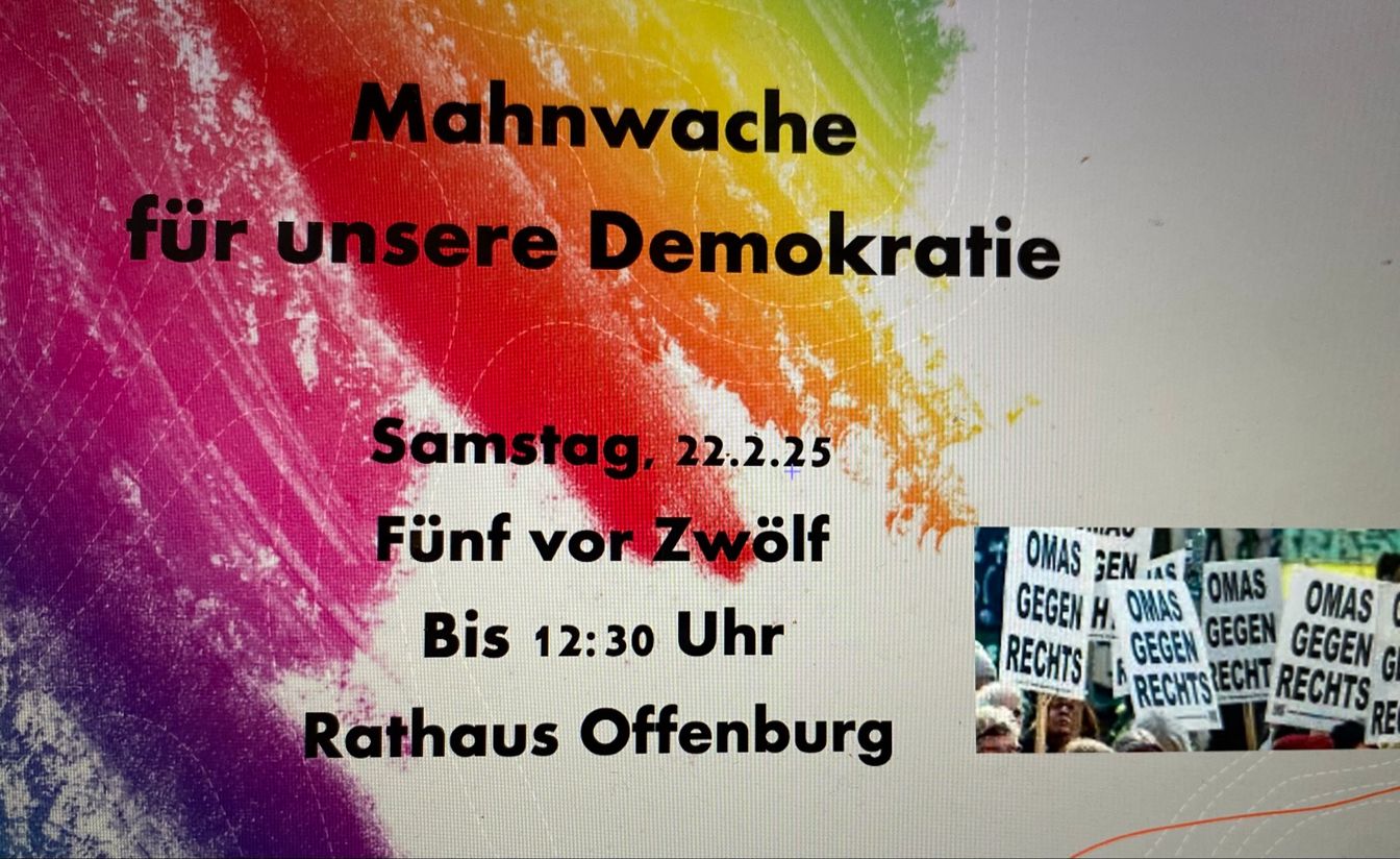 Die Omas Offenburg machen von 11.55 Uhr bis 12:30 Uhr eine Mahnwache für die DEMOKRATIE an der Ursula-Säule!