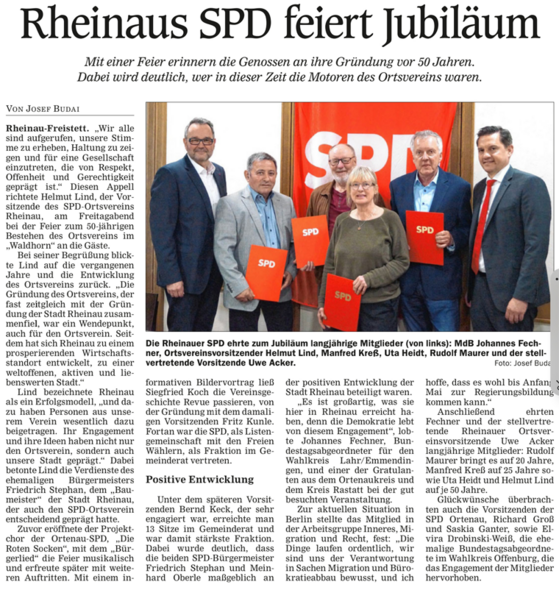 Diesen Appell richtete Helmut Lind, der Vorsitzende des SPD-Ortsvereins Rheinau, am Freitagabend bei der Feier zum 50-jährigen Bestehen des Ortsvereins im "Waldhorn" an die