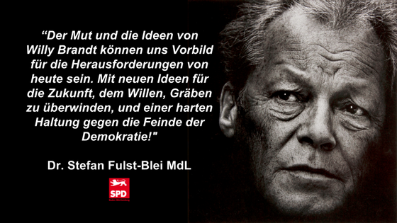 Der Mut und die Ideen von Willy Brandt können uns Vorbild für die Herausforderungen von heute sein. Mit neuen Ideen für die Zukunft, dem Willen, Gräben zu überwinden, und einer harten Haltung gegen die Feinde der Demokratie!