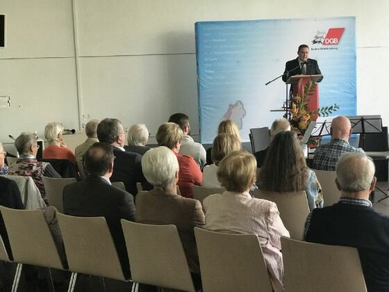 Lars Treusch vom DGB Region Rhein-Neckar eröffnet den Empfang zum Tag der Gewerkschaften. Ich bin gerne gekommen. Wir brauchen starke Gewerkschaften, gerade bei dem was sich aktuell in Berlin vielleicht zusammenbraut.