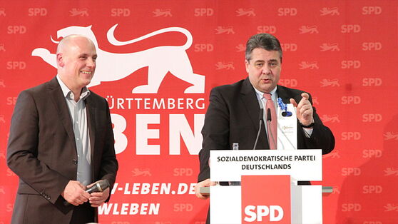 Schwetzingen. Sigmar Gabriel kam mit dem Flieger von Braunschweig nach Mannheim und war um 14.40 Uhr in Schwetzingen. Dann allerdings gab's Regierungsgeschäfte, die telefonisch in der Friedrichstraße in der Parkbucht erledigt werden mussten, so dass er erst um 14.55 Uhr auf dem Schlossplatz aus dem gepanzerten Wagen steigen konnte. Das Publikum im mit 200 Besuchern voll besetzten Palais Hirsch wurde inzwischen köstlich vom "Als wir"-Improvisationstheater unterhalten. Und Daniel Born machte klar, dass die SPD diese Woche nochmals alles mobilisiere, von 5 Uhr früh an der Bushaltestelle bis abends in der Kneipe will er mit möglichst vielen Menschen ins Gespräch kommen: "Wir kämpfen ums Direktmandat und darum, dass die Rechten, die den Sekt schon kaltgestellt haben, ein Debakel erleben."