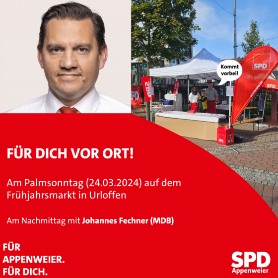 Am Palmsonntag, 24.03.2024, sind wir wieder mit einem Stand am Frühjahrsmarkt in Urloffen vertreten. Zudem wird uns Johannes Fechner, Mitglied des Bundestags, zwischen 14:00 und 15/15:30 Uhr besuchen kommen und steht interessierten Bürgerinnen und Bürgern für Fragen zu aktuellen Themen zur Verfügung.