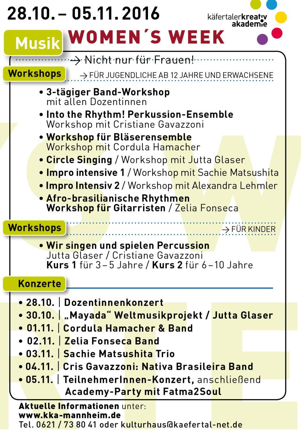 Dazu präsentieren sich die Musikerinnen an einem Abend mit ihrer jeweiligen Band. Am 30.10. ist in der Reihe „Konzerte für Geflüchtete und Einheimische“ das Weltmusik-Projekt „Mayada“ der Sängerin Jutta Glaser mit Musikern aus Gambia, Afghanistan und dem Senegal, dem Gitarristen Jörg Teichert und der aus Brasilien stammenden Perkussionistin Cristiane Gavazzoni zu hören, am 01.11. „Cordula Hamacher & Band“ , am 2.11. die „Zelia Fonseca Band“, am 3.11. das „Sachie Matsushita Trio“ und am 4.11.spielt Cris Gavazzonis „Nativa Brasileira Band“ Tango Brasileiro. Den Abschluss bildet am 5.11. das Teilnehmer/Teilnehmerinnen-Konzert und eine anschließende Academy-Party mit Fatma2Soul.
